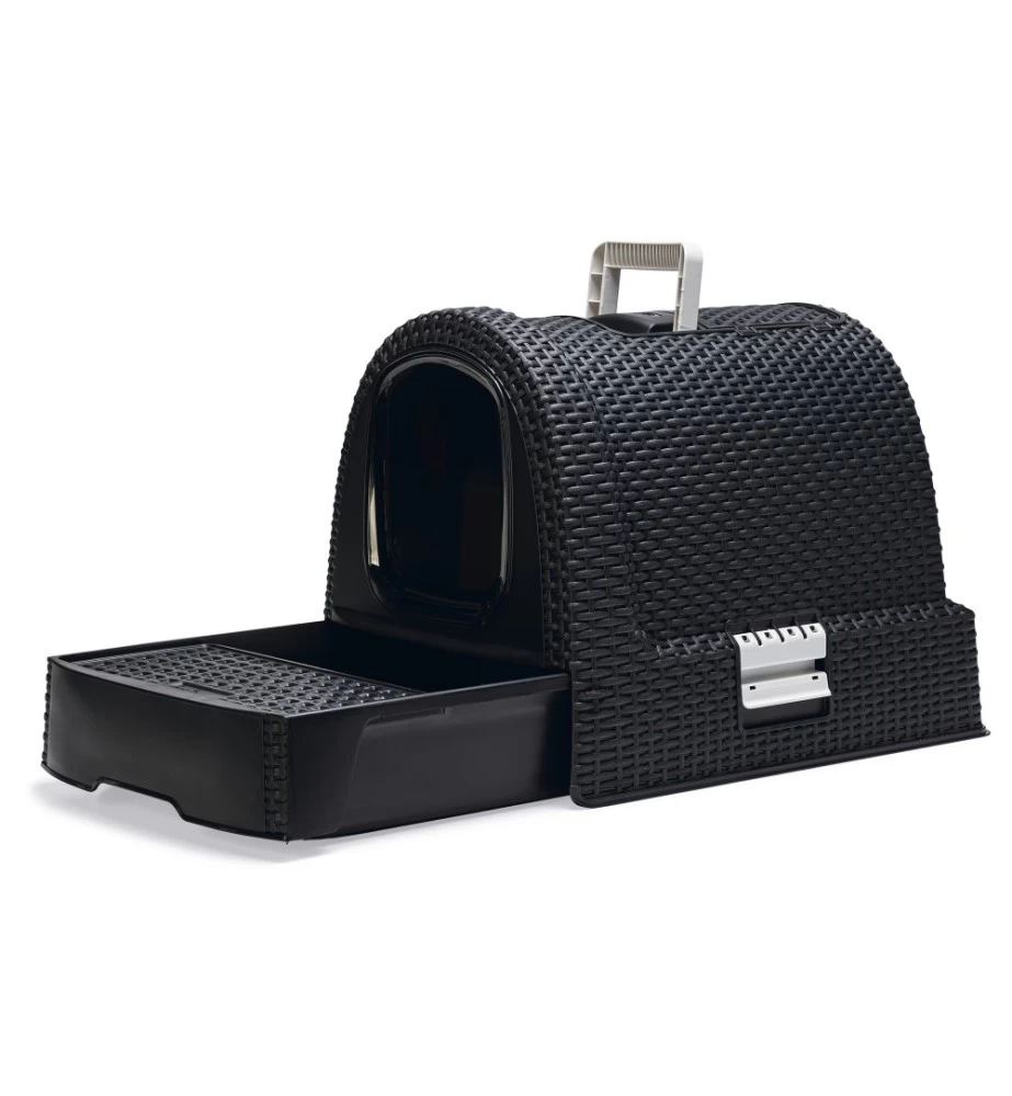 De Curver kattenbak heeft een modieuze uitstraling doordat het een motief heeft van gevlochten rattan. De lade aan de voorkant heeft een plateau met gaatjes, waardoor de kat een groot deel van het kattenbakgrit achterlaat in de bak alvorens de kattenbak te verlaten. Door de uitschuifbare lade kan je in een oogopslag zien of de kattenbak aan verschoning toe is. Aan de bovenkant van de kattenbak bevindt zich een klepje waar de kattenbakschep opgeborgen kan worden.