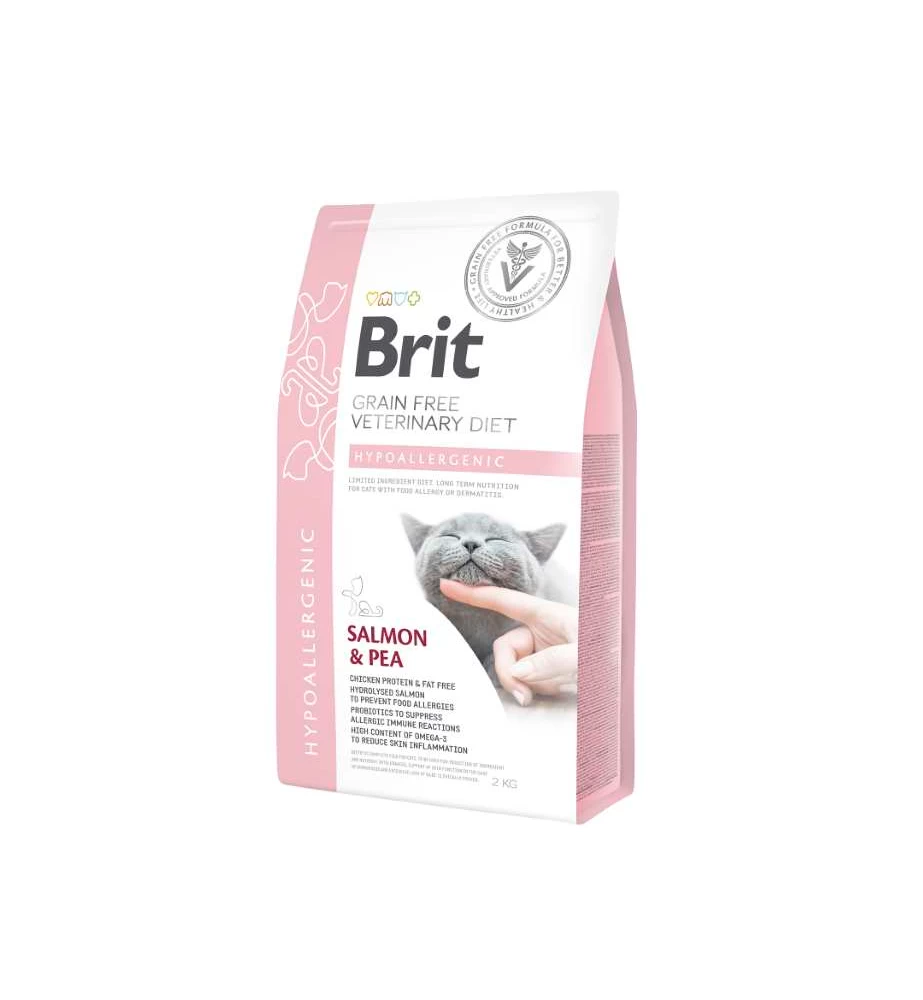 Brit Grain Free Veterinary Diet Hypoallergenic is een complete graanvrije voeding op basis van zalm en erwten voor katten die ingezet kan worden wanneer deze te maken hebben met dermatologische of gastro-intestinale klachten als gevolg van een voedingsovergevoeligheid of voedingsallergie.