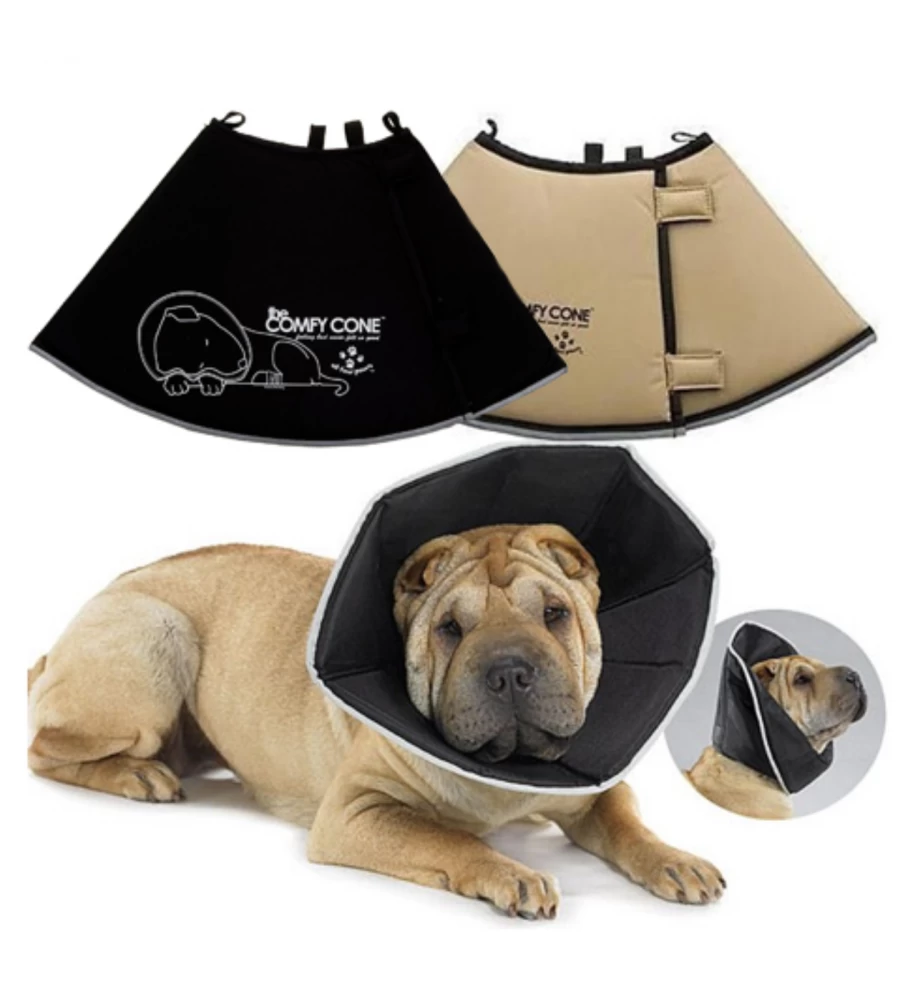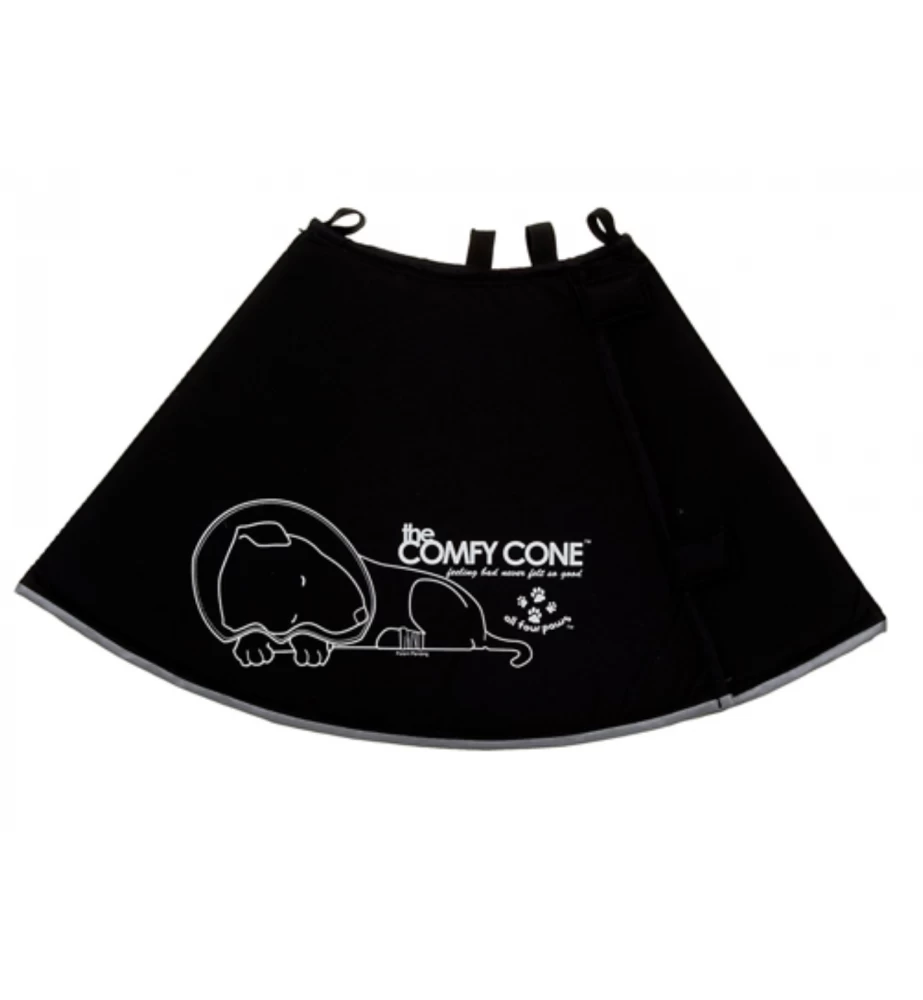 De Comfy Cone is een zachte comfortabele kegelvormige kraag voor honden en katten ter voorkoming van het likken en bijten aan helende wonden. De Comfy Cone is gemaakt van gelamineerd nylon over een stevige foamlaag. Hierdoor geeft deze kraag mee als het dieren ergens tegen aanloopt en voorkomt zo schade aan meubels en interieur. De kraag kan omgevouwen worden waardoor het mogelijk is voor het dier om te eten en drinken. De Comfy Cone is waterbestendig & – afstotend en is gemakkelijk vast te maken met de eigen halsband. Door middel van klittenband kan deze eenvoudig op maat gemaakt worden.