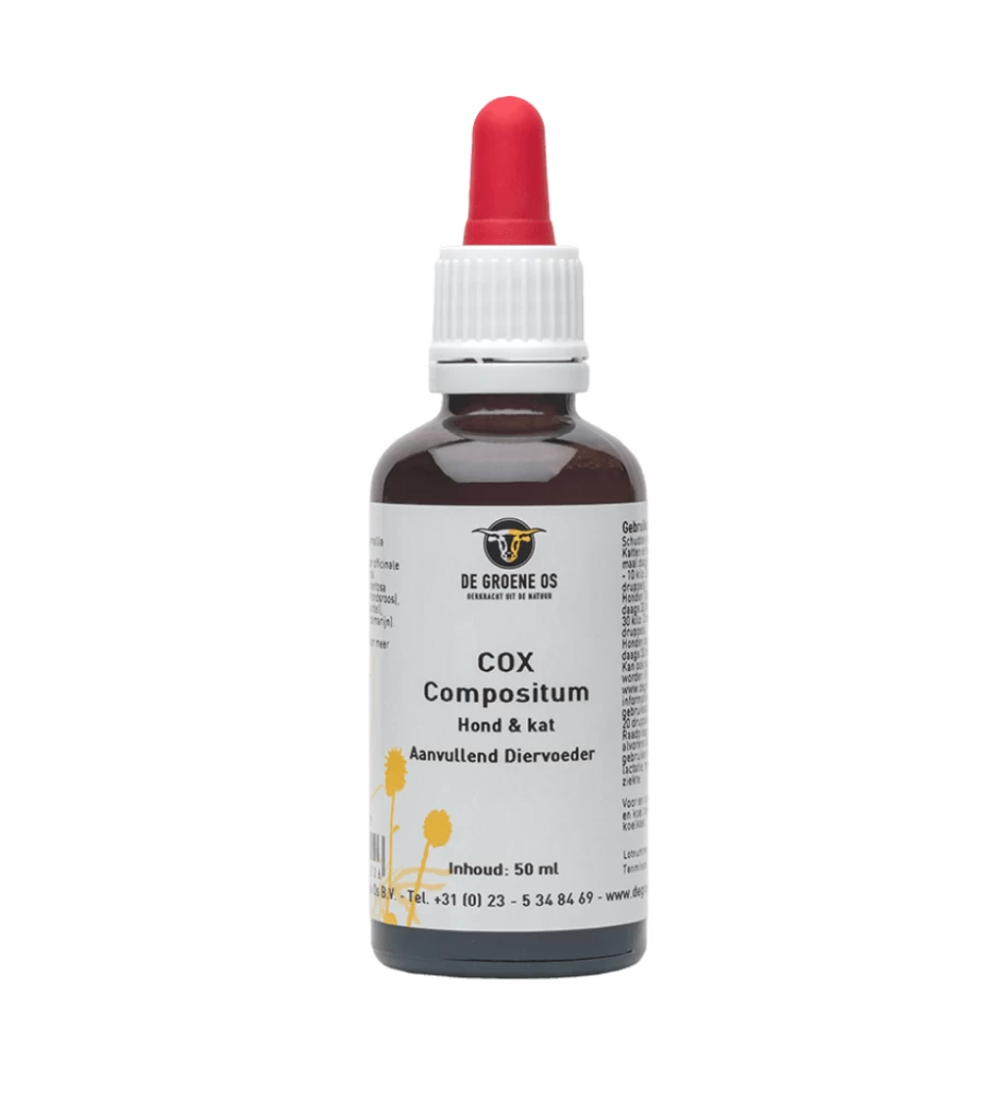Het De Groene Os COX Compositum is een 100% natuurlijke tinctuur voor honden, katten en konijnen met Cyclo-oxygenase (COX) als werkzame stof. COX speelt een essentiële rol in het maken van prostaglandine, dat op zijn beurt belangrijk is voor het hele lichaam. Pijnstillers zoals NSAID’s remmen de werking van COX en daarmee ook de vorming van prostaglandine.