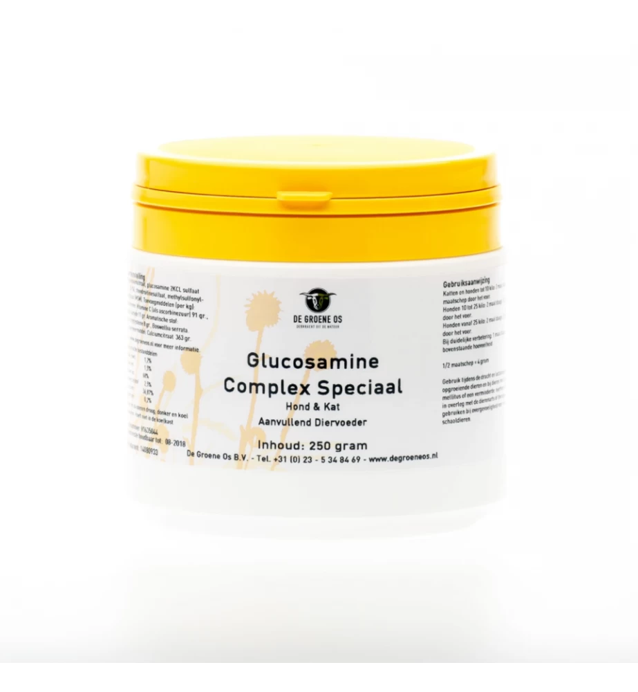 Het Glucosamine Complex Speciaal van De Groene Os is een aanvullend diervoeder voor honden en katten ter ondersteuning van de gezonde gewrichten. Het middel heeft een positieve invloed op de conditie van de gewrichten, het kraakbeen, het bindweefsel, de spieren, de banden en de kapsels.