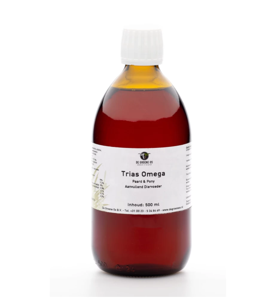 Trias Omega van De Groene Os is een smakelijk en gezond aanvullend diervoeder voor paarden en pony’s. Het is een mengsel van koudgeperste oliën die rijk zijn aan Omega-3, -6 en -9 vetzuren.