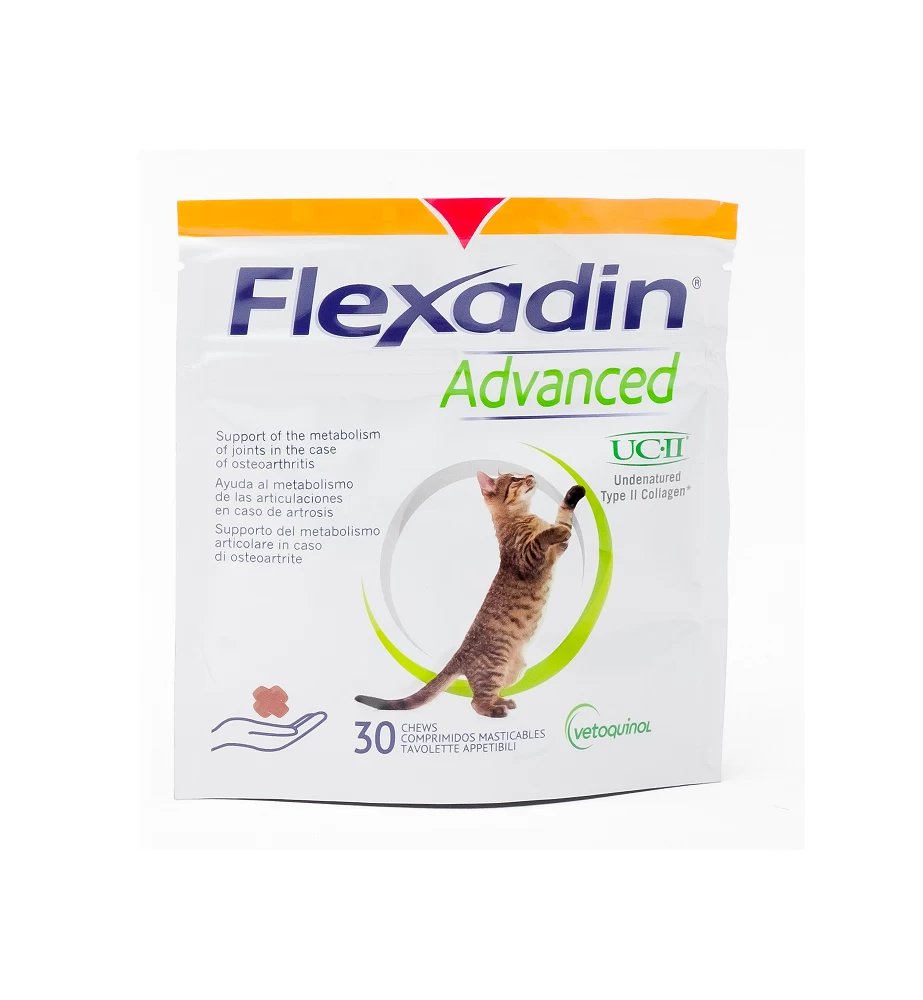 Flexadin Advanced Cat is een smakelijk en innovatief voedingssupplement met UCI-II® ter ondersteuning van de gewrichten (o.a. osteoartritis) bij katten.