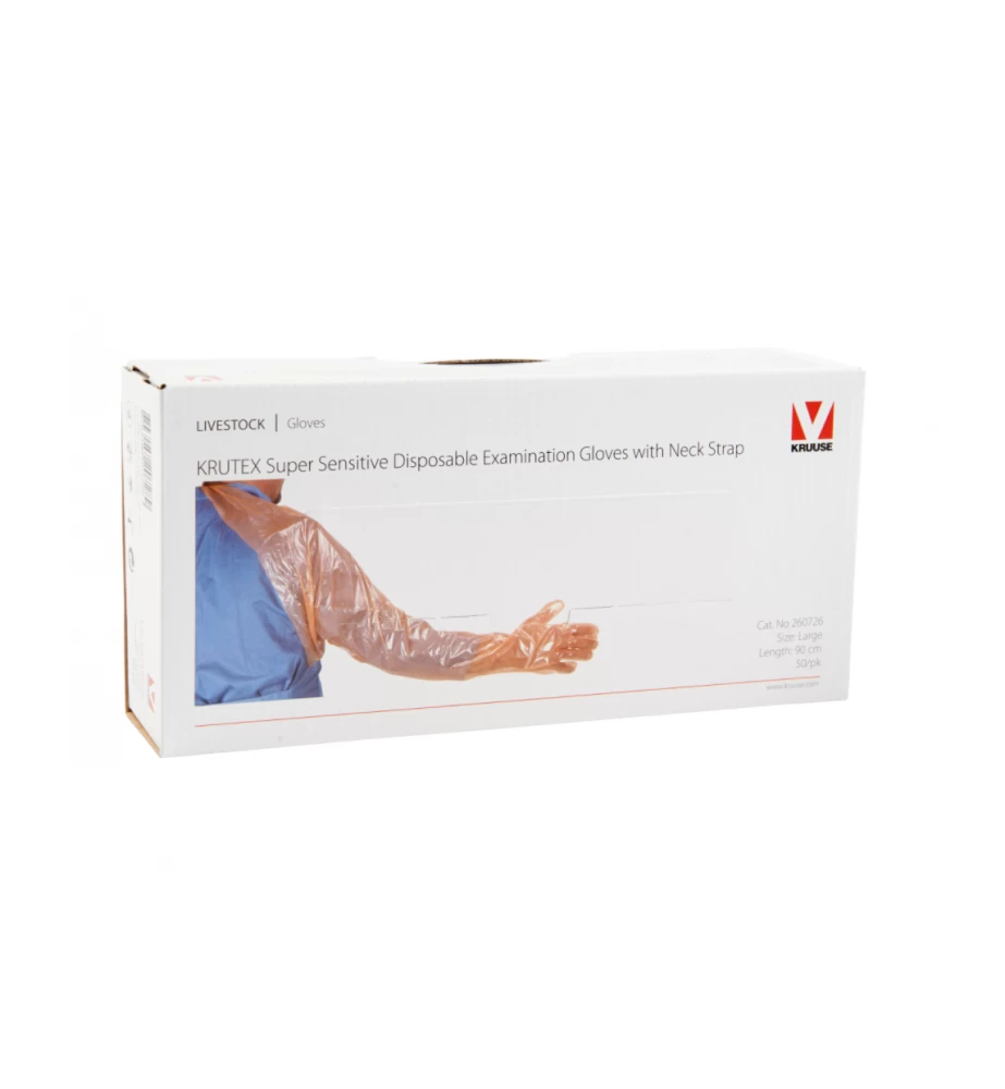 Extra lange sensitive handschoenen van de fabrikant Kruuse voor rectaal onderzoek bij landbouwdieren zoals runderen en paarden. De handschoenen zijn 90 cm lang en kunnen doormiddel van een neckstrap aan het lichaam vastgemaakt worden.