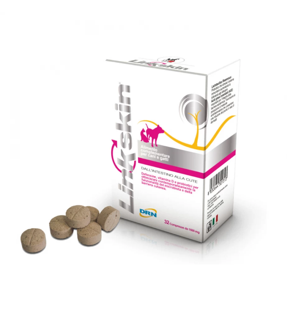 Linkskin van DRN zijn tabletten voor honden en katten ter ondersteuning van een gezonde huid- en darmflora. De Linkskin bevat levende en vitale lactobacillen (Probiotica) die een positief effect hebben op de darm- en huidfunctie. Daarnaast kan het middel ook gebruikt worden ter ondersteuning bij honden en katten met allergische atopische dermatitis. Naast de lacotbacillen bevat Linkskin ook Komkommer extract, Teneunisbloemolie en Vitamine D3 die een natuurlijk beschermingsmechanisme zijn voor de huid en darmen.