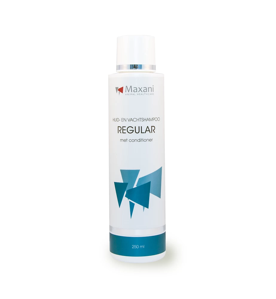 De Maxani Regular Shampoo is door de milde en reinigende samenstelling geschikt voor het regelmatig wassen van de normale tot droge huid. De huidshampoo verzorgt, voedt en beschermt de huid en geeft de vacht een gezonde glans. Tevens zeek geschikt voor puppy’s en kittens te wassen. De Regular Shampoo is parfumvrij en neutraliseert onaangename geurtjes. Daarnaast bevat de Maxani Regular Shampoo conditioner, wat de vacht beter doorkambaar maakt. Het is een shampoo en verzorgende bodylotion in één. De Regular Shampoo bevat voedende en beschermende ingrediënten zoals kamille, calendula, panthanol en honing.