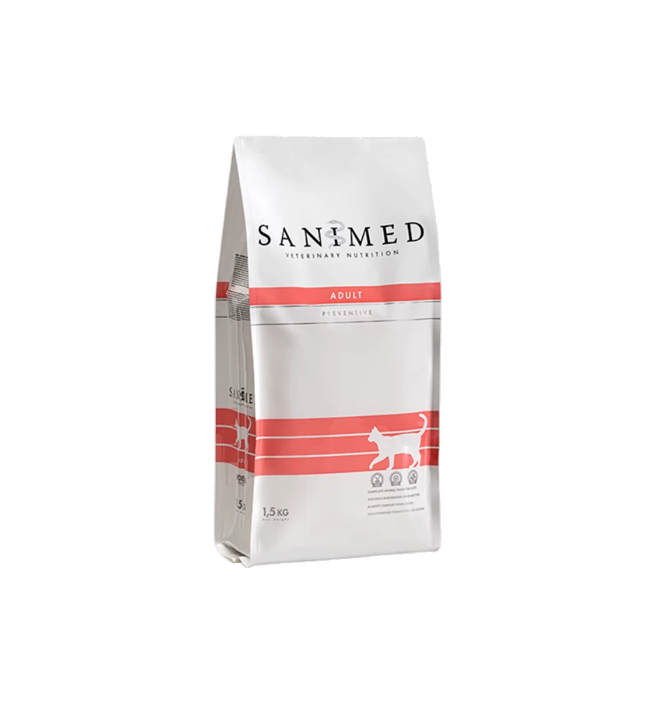 Sanimed Adult is een volledig diervoeder voor volwassen katten. Volwassen katten groeien niet meer, daarom is het belangrijk om hun lichaamsconditie goed in de gaten te houden. Sanimed Adult is afgestemd op de specifieke behoeften aan voedingsstoffen van volwassen katten van alle rassen.