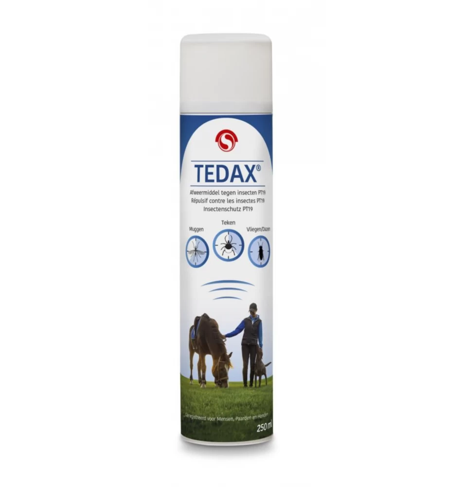 Tedax van Sectolin een een spray met een werende werking tegen insecten zoals (tropische) muggen, steekvliegen/dazen, stalvliegen en teken bij paarden (niet voor consumptie), honden en mensen.