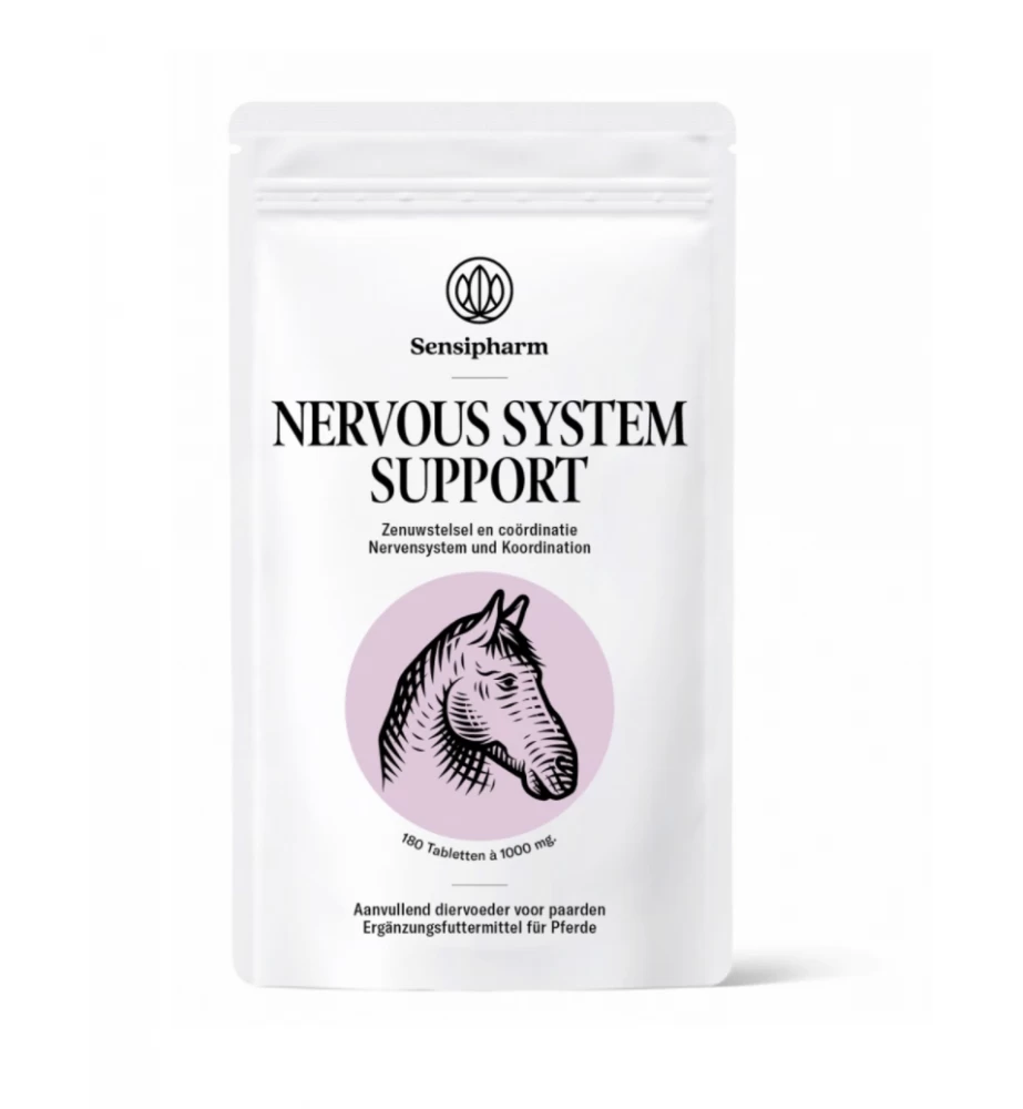 Sensipharm Nervous System Support 100% natuurlijk voedingssupplement op basis van Chinese kruiden ter ondersteuning van de hersenen en de zenuwen bij paarden en pony’s. Het middel werkt zenuwversterkend, heeft een gunstige werking op de coördinatie en draagt bij aan de ontwikkeling van de hersenen.