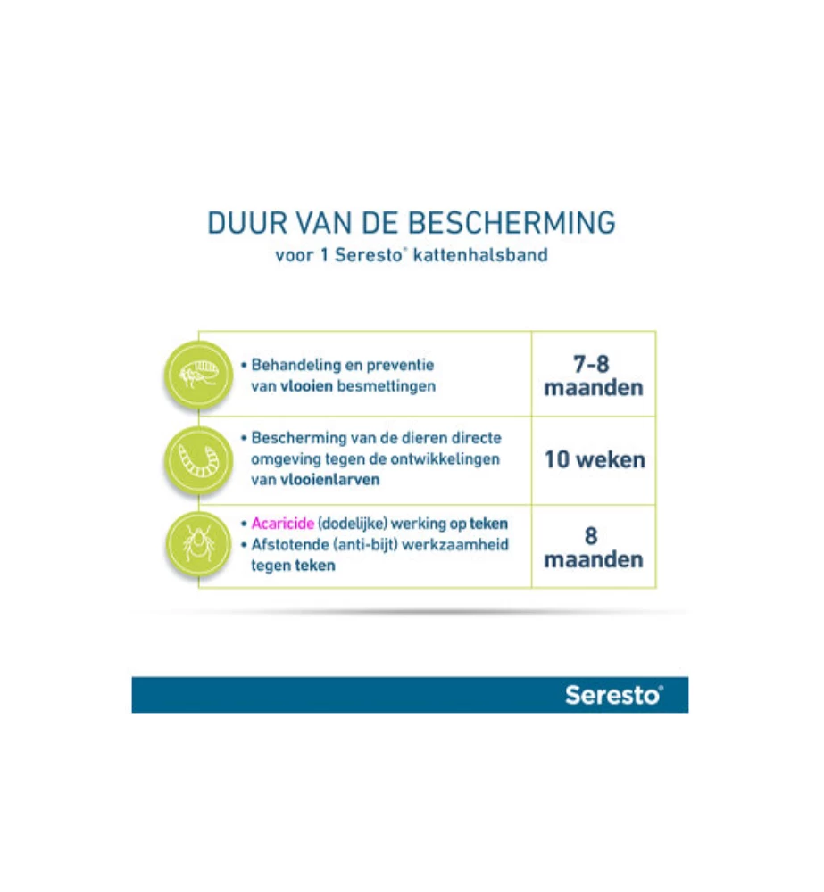 De halsband dient gedurende de beschermingsperiode van 8 maanden continu gedragen te worden en verwijderd te worden op het einde van deze periode. Controleer op regelmatige basis de strakheid en pas deze aan indien nodig, vooral bij snelgroeiende kittens.