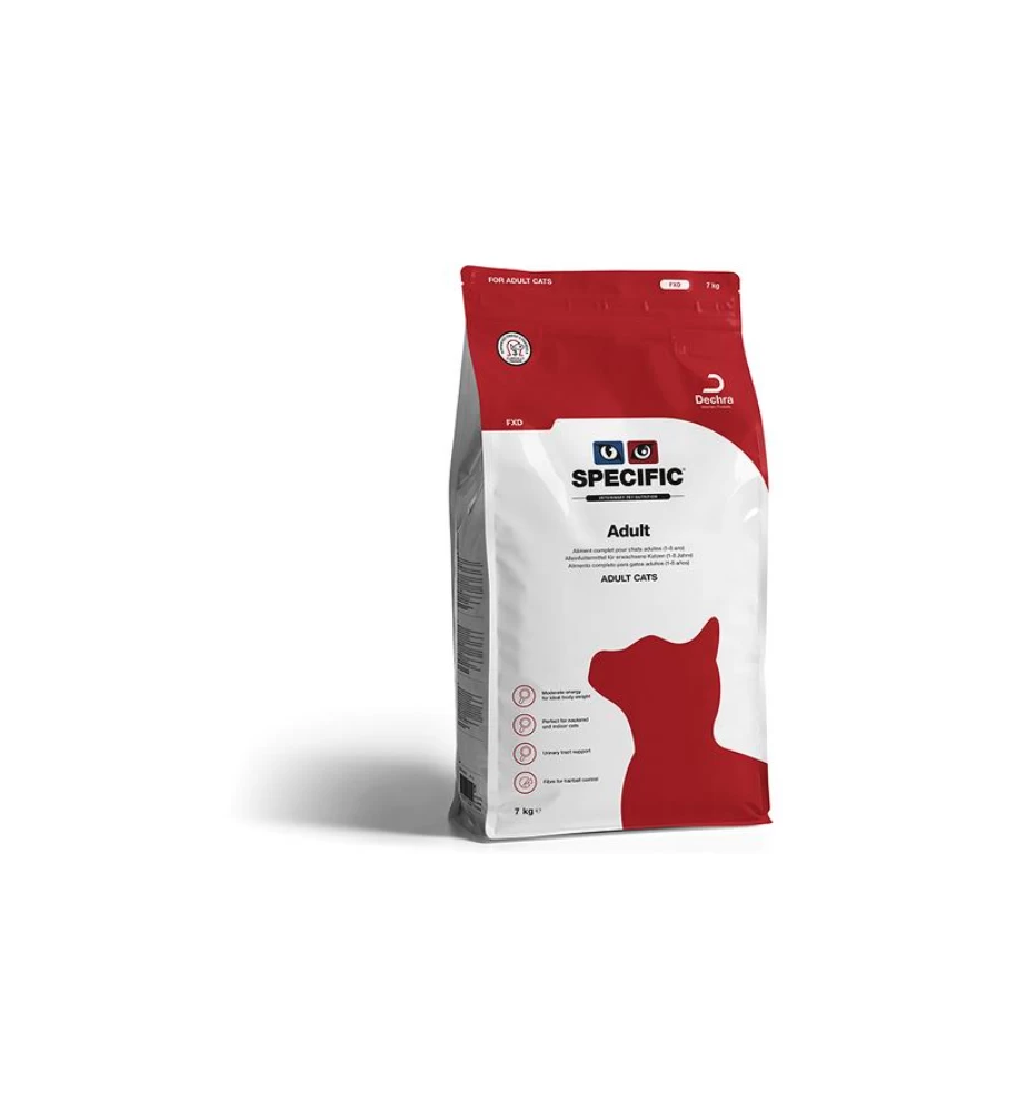 Specific Adult FXD is een complete en uitgebalanceerde voeding voor volwassen katten. De beperkte energiewaarde zorgt voor het behoud van het ideaal lichaamsgewicht. Daarnaast is de voeding rijk aan Omega-3 vetzuren die zorgen voor een gezonde vacht en huid. Tevens zorgen de Omega-3 vetzuren voor het behoud van soepele gewrichten.