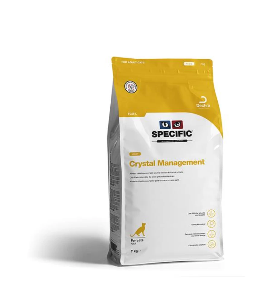 Specific Crystal Management Light FCD-L is een dieetvoeding voor katten de preventief werkt tegen de vorming van struviet- en calciumoxalaat gruis. Vanwege de lage energiewaarde is deze voeding ideaal voor katten die problemen hebben met overgewicht. Door het lage gehalte aan natrium is deze voeding geschikt om langdurig te geven. In het Specific Crystal Management Light FCD-L dieet zitten minder mineralen (magnesium & fosfor) wat ervoor zorgt dat zich geen nieuwe kristallen vormen. Daarnaast is de voeding rijk aan Omega-3 vetzuren uit vis (EPA & DHA) wat zorgt voor een gezonde vacht, huid en soepele gewrichten.