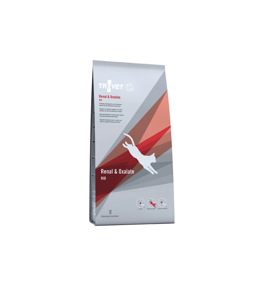 De Trovet Renal & Oxalate RID voeding is een complete dieetvoeding is speciaal afgestemd op de behoefte van katten met chronisch nierfalen. Het bevat een beperkt gehalte aan eiwitten en minder fosfor om belasting van de nieren te beperken. De gebruikte eiwitten zijn van hoge kwaliteit. Daarnaast bevat de Trovet Renal & Oxalate RID extra veel energie, zodat de kat bij een verminderde eetlust een kleinere hoeveelheid hoeft te eten om toch in de dagelijkse energiebehoefte te voorzien.