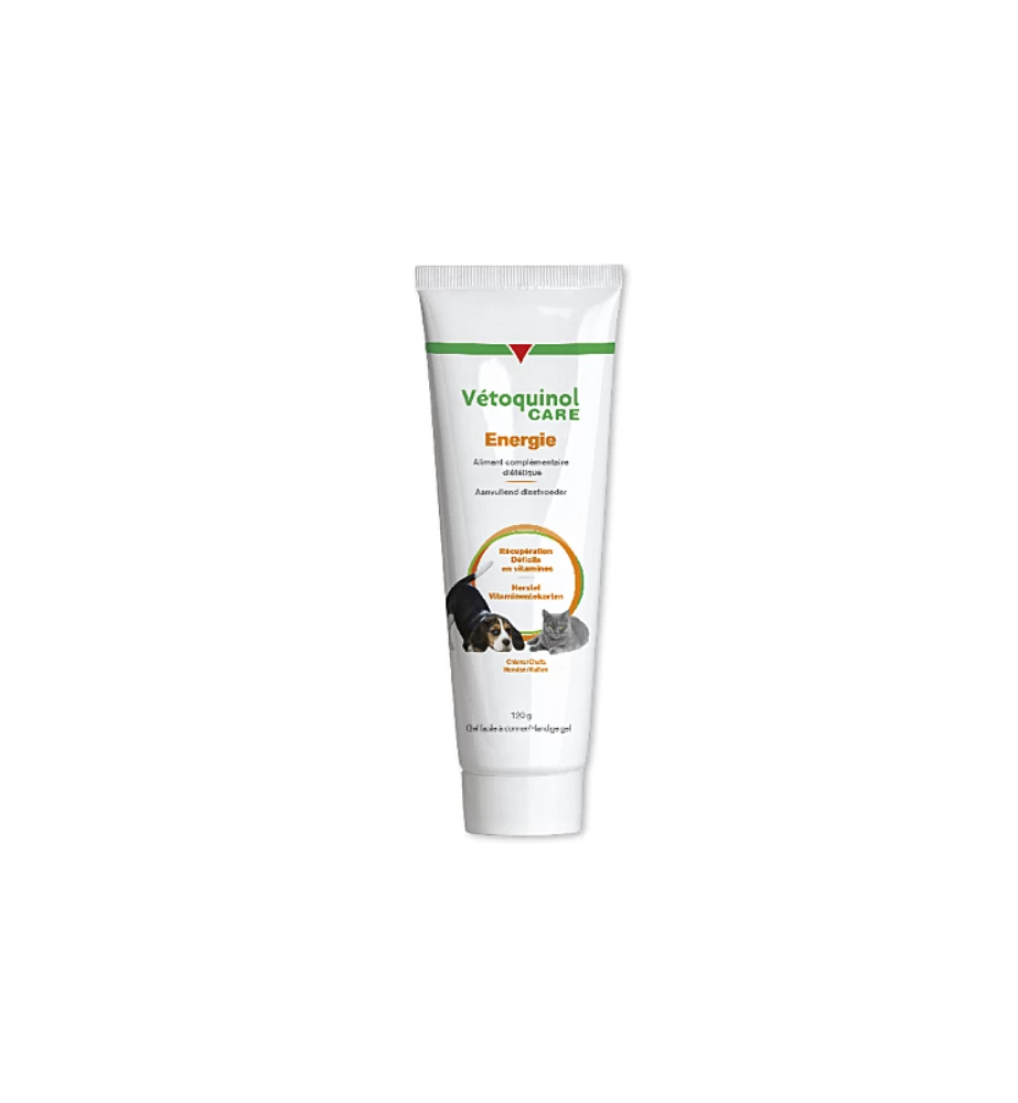Energie van Vétoquinol Care is een smakelijke gel voor honden en katten die extra energie en kracht nodig hebben. Naast het hoge energie gehalte is de Energie gel ook aangevuld met vitaminen en mineralen.