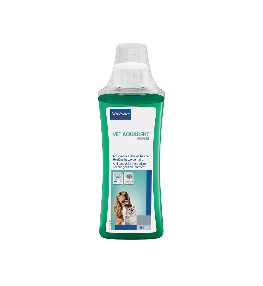 Vet Aquadent Fr3sh is een mondwater voor honden en katten op basis van natuurlijke ingrediënten. Deze smakelijke vloeistof kan ingezet worden ter bestrijding van tandplaque, tandsteen en een slechte adem. Het kan eenvoudig aan het drinkwater van de hond of kat worden toegevoegd.