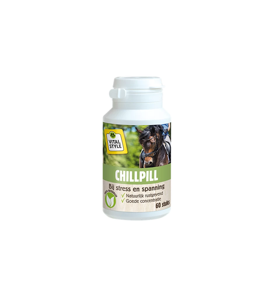 De ChillPill van VitaStule is een 100% natuurlijk en dopingvrij voedingssupplement voor paarden dat ingezet kan worden in situaties van stress zoals wedstrijden, training, transport of verandering van omgeving. Het bevat een optimale combinatie van natuurlijke ingrediënten die zorgen voor meer innerlijke rust en een goede concentratie.