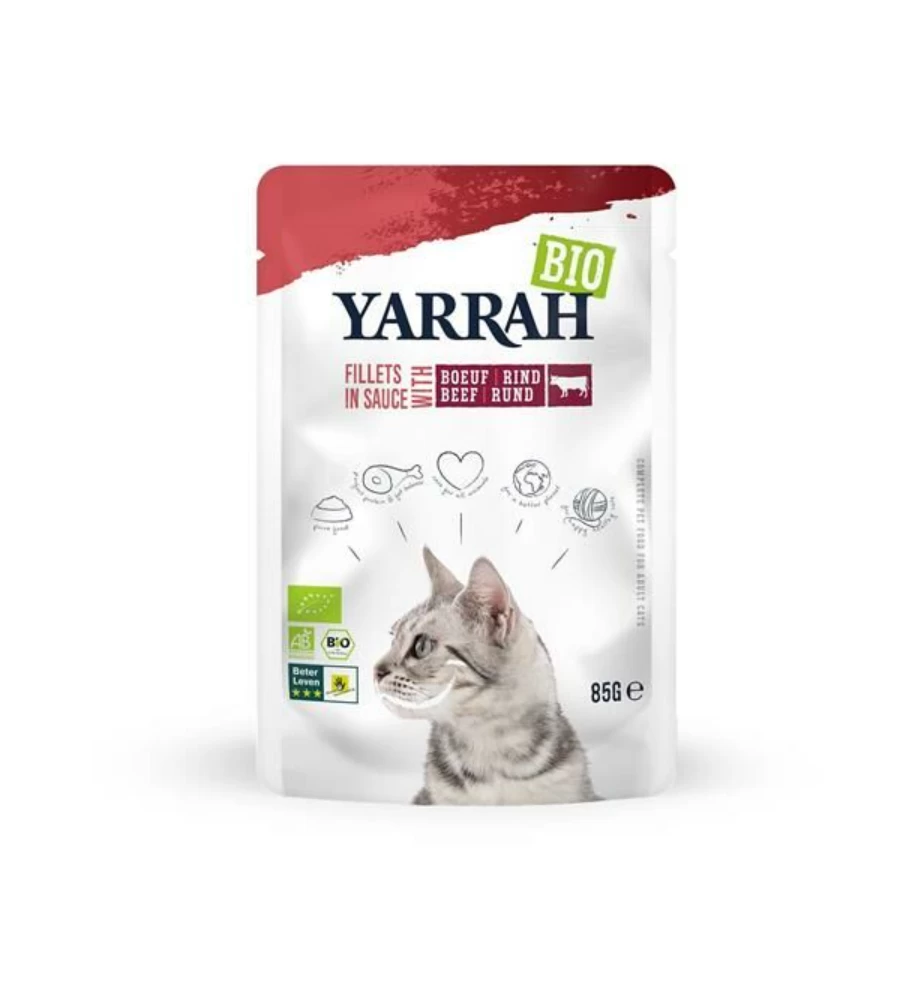 Deze 85 grams pouch bevat biologische rund en kip. De biologische kippen en runderen verwerkt in het voer hebben een beter leven gehad, waarbij ze vrij buiten hebben mogen lopen, puur biologisch hebben gegeten en langer hebben mogen leven dan reguliere kippen en runderen. Biologisch rund is gecombineerd met biologische kip om de impact op het milieu te beperken, omdat kip een kleinere ecologische voetafdruk heeft dan rundvlees. Het biologische erwtenzetmeel in het natvoer voor de kat is rijk aan vezels. Het helpt daarnaast de bloedsuikerspiegel laag te houden.