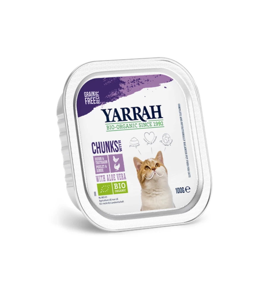 Het alu-kuipje met chunks in saus is een praktische, complete maaltijd voor je kat. Yarrah adviseert natvoer voor iedere kat. Natvoer bevat veel vocht en helpt je kat gehydrateerd te blijven. Vooral oudere katten en katten die weinig drinken, hebben baat bij een dagelijkse portie natvoer.